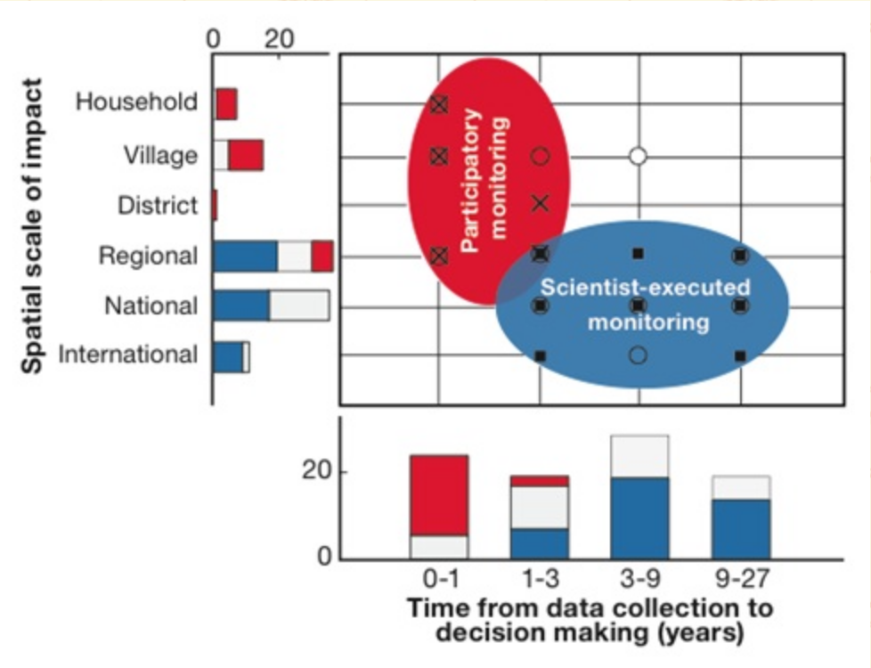 This graph shows the spatial and temporal scale of decision-making from environmental monitoring, based on data from published monitoring schemes 1989–2009 (n = 104). The circles comprise all the scientist-executed (blue) and all the participatory monitoring schemes (red). The bar chart indicates the number of scientist-executed monitoring schemes (blue bars), monitoring schemes with local data collectors (white bars) and participatory monitoring schemes (red bars) at each level of spatial scale and implementation time. From J. Appl. Ecol. 47: 1166-1168 (2010).